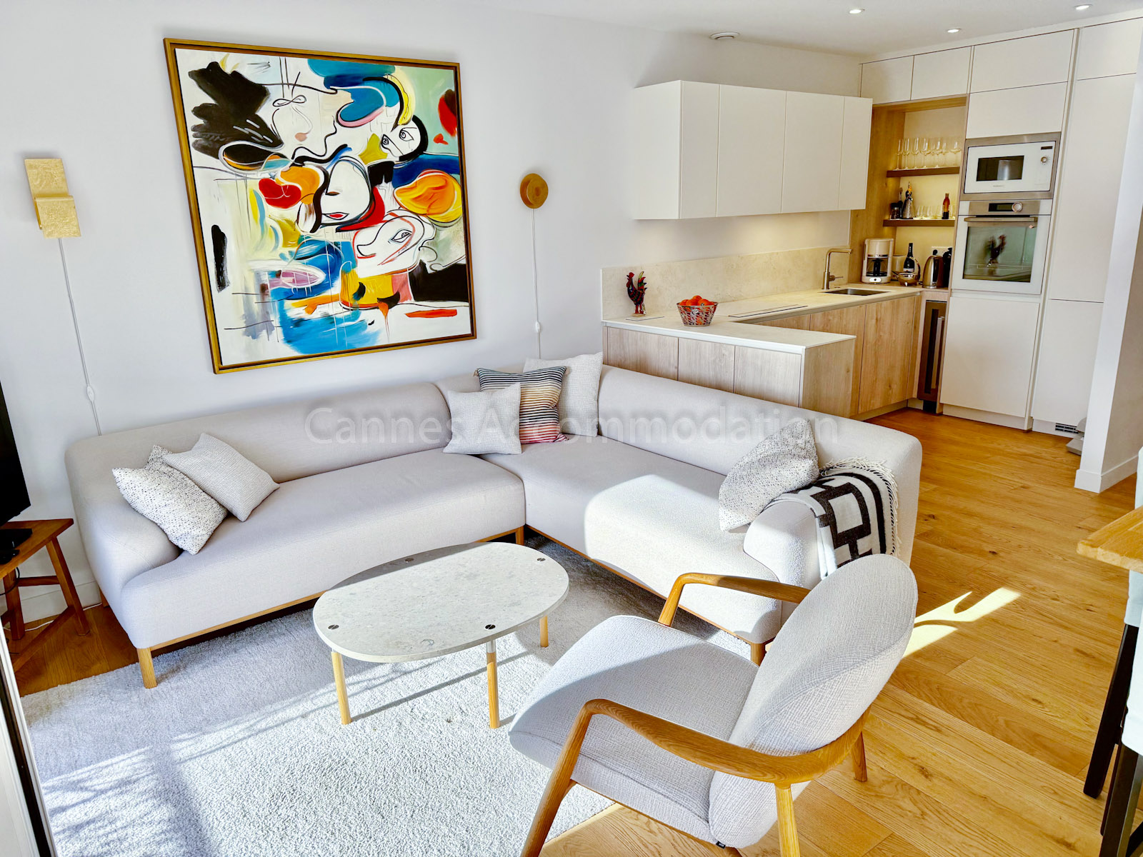 The main room is organised into two distinct areas: the living area with TV and the dining area. The decoration is all about subtle shades of white with some touches a colors on the art.