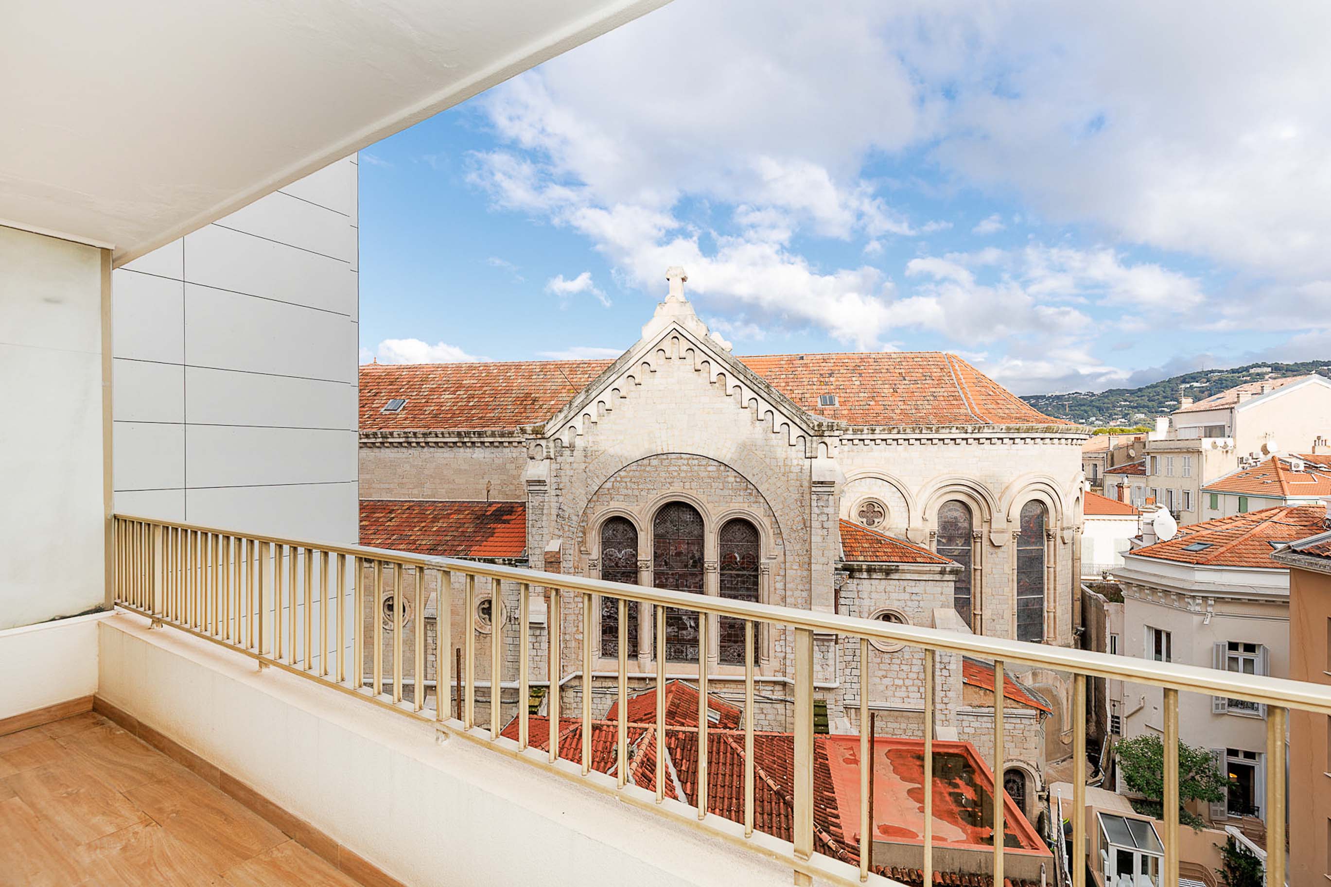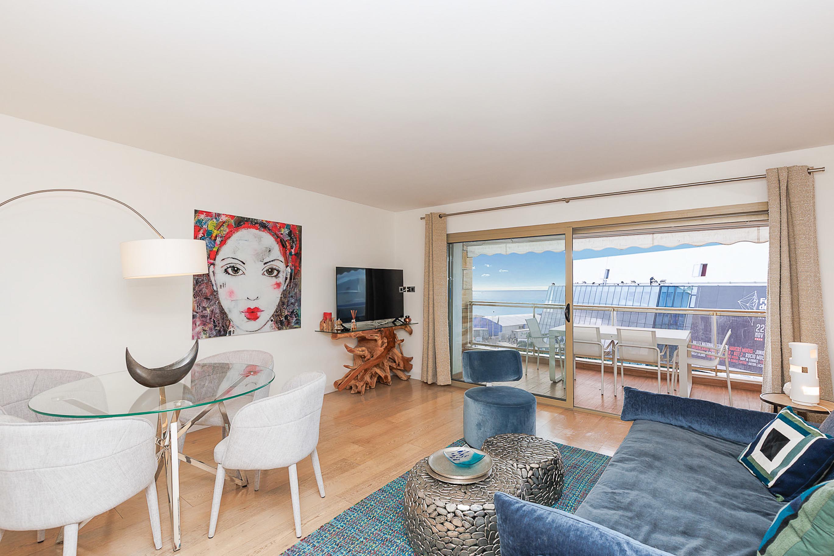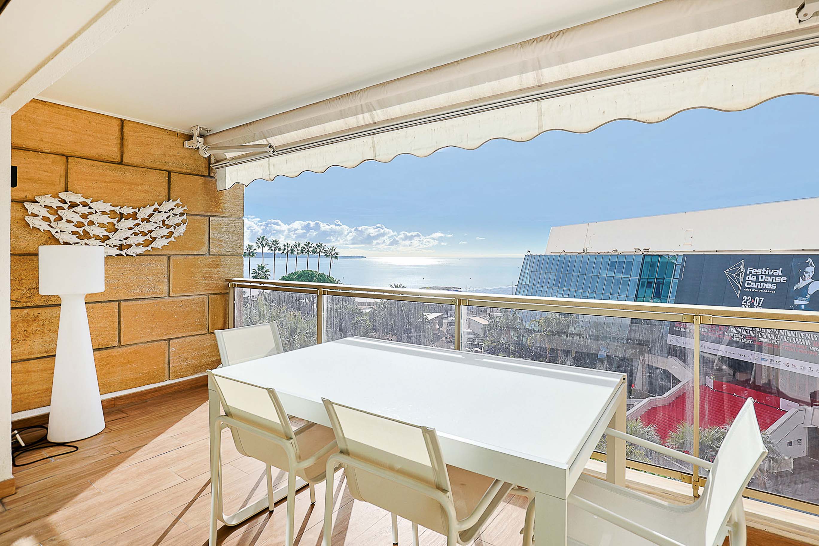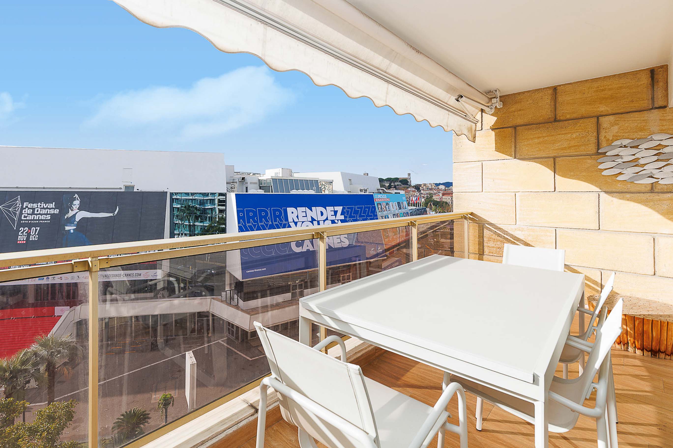 The apartment opens onto a spacious front terrace with a stunning view of the sea and the Palais. This outdoor living space is ideal for relaxing or enjoying meals with a Mediterranean backdrop. At the rear, a smaller balcony offers a more private setting.