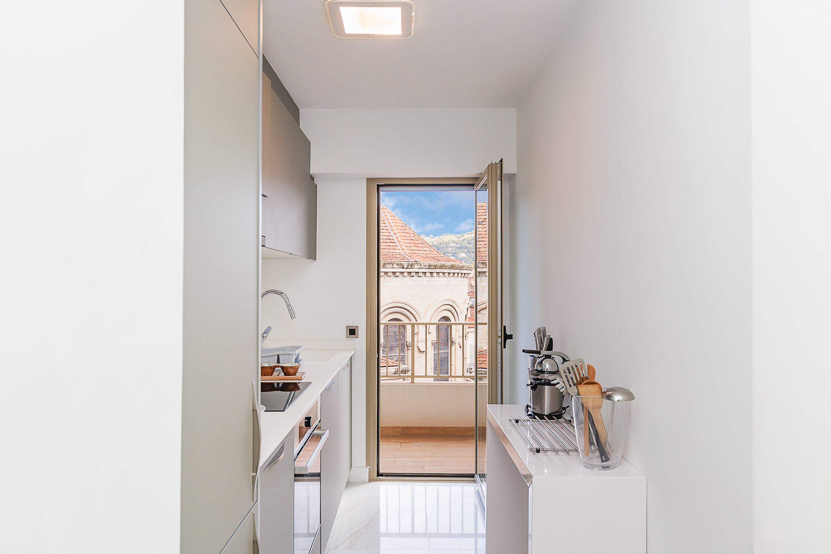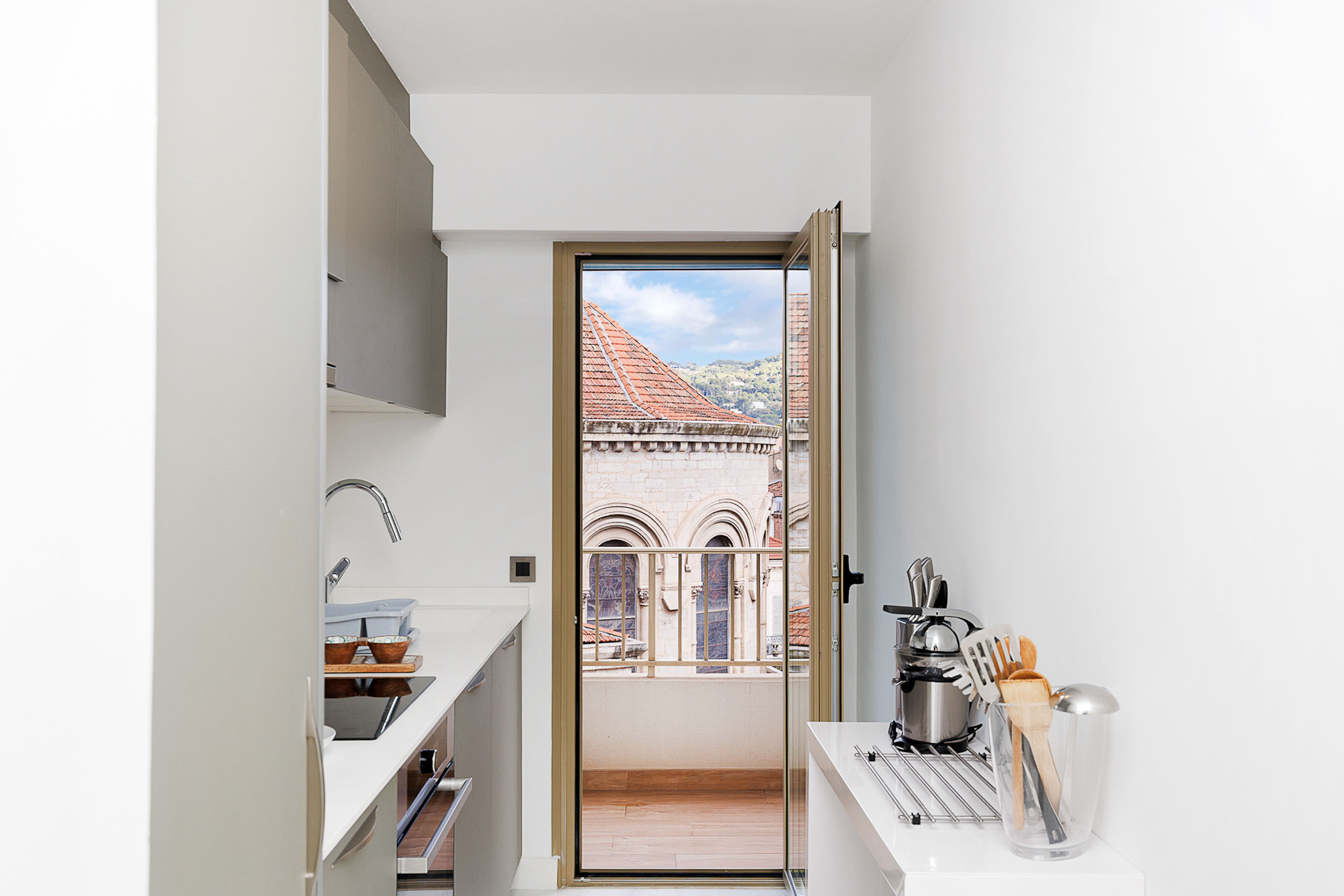 The sleek, contemporary kitchen also opens onto the balcony. Functional and well-equipped, it’s perfect for longer stays.
