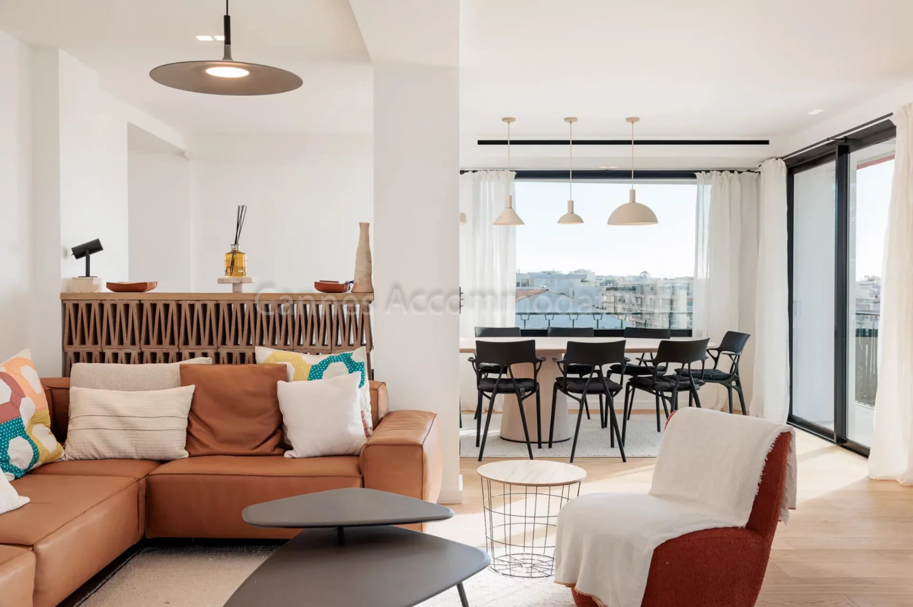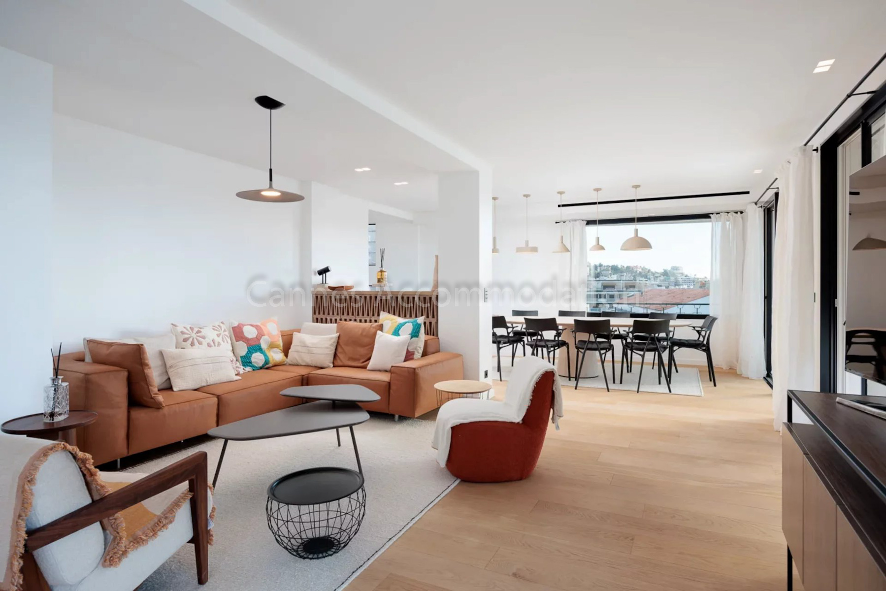 The dining area can comfortably seat up to 10 guests around a stylish designer table. The whole space is both structured and convivial. The kitchen is fully fitted with top-of-the-line appliances.