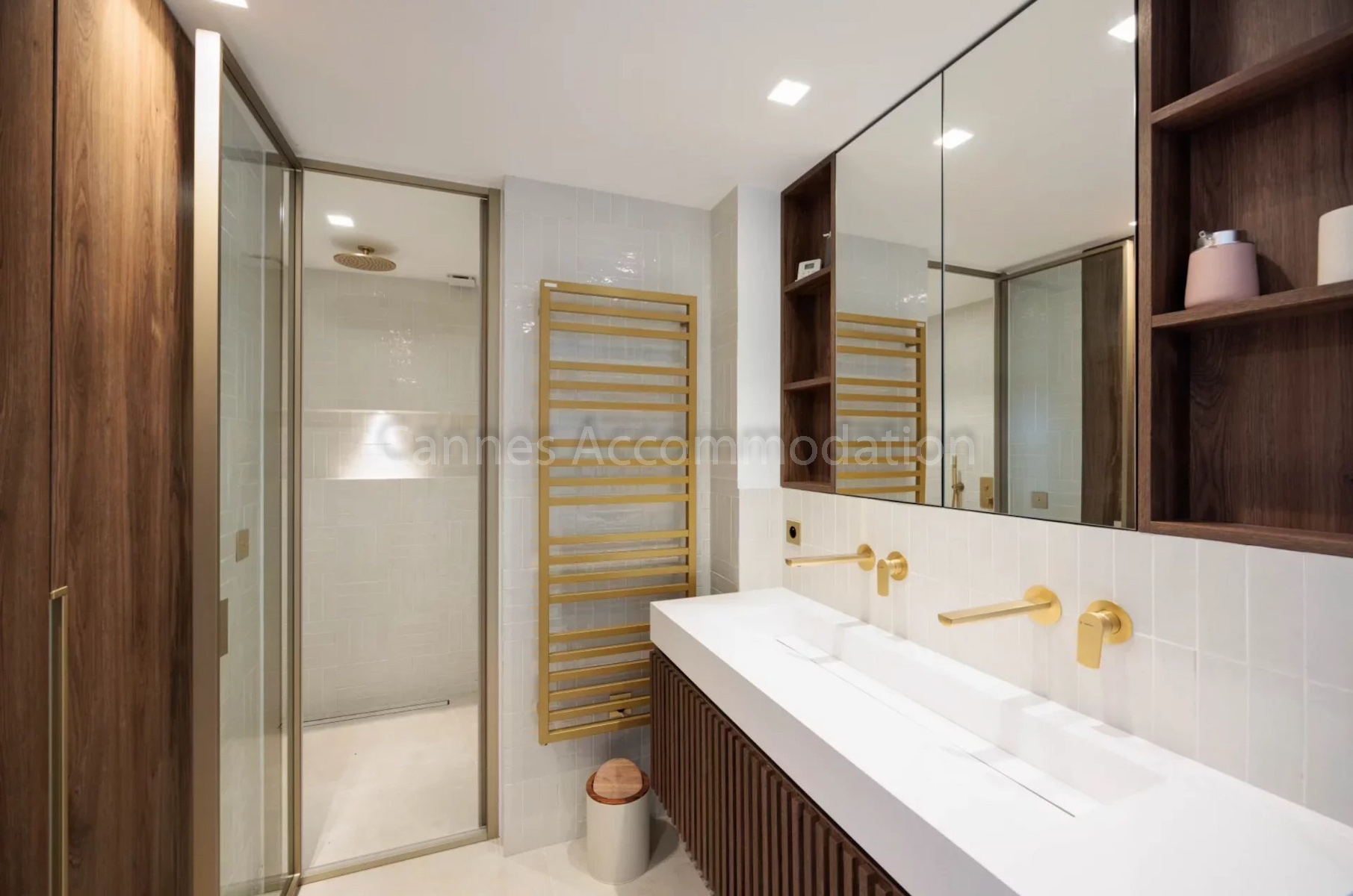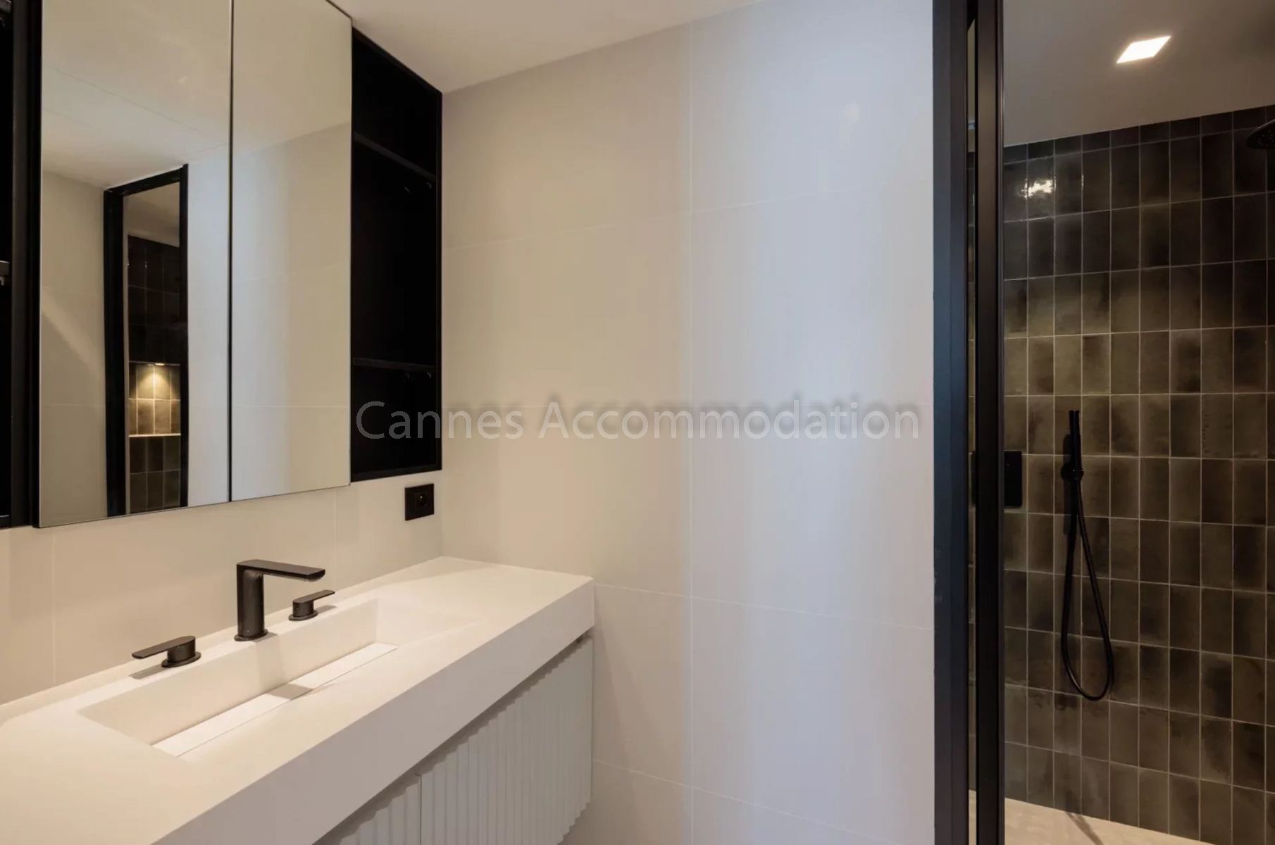 The first bedroom, adjacent to the living room, comes with its own shower room. The three other bedrooms are located at the back of the apartment, overlooking the hills. One of them also benefits from its own shower room, while the other two share a charming bathroom with both bathtub and shower.