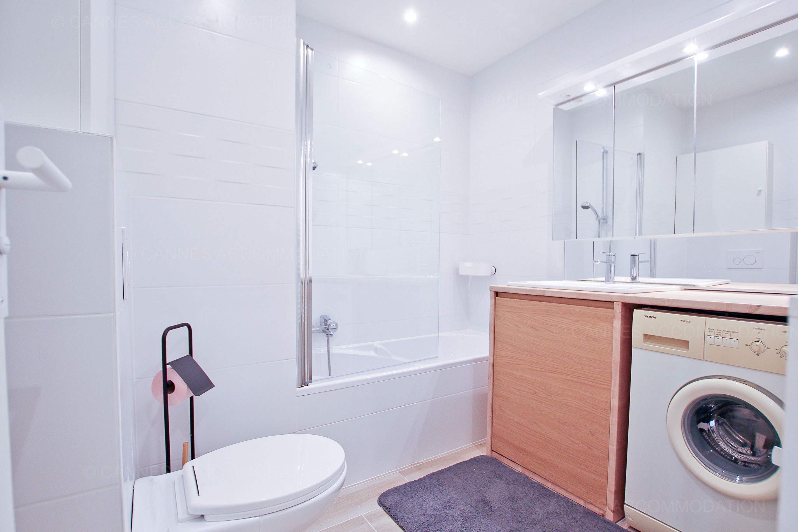 The bathroom, modern and functional, includes a bathtub with a shower screen, a vanity unit topped with a large mirror, and also houses a washing machine—an undeniable asset for longer stays.
