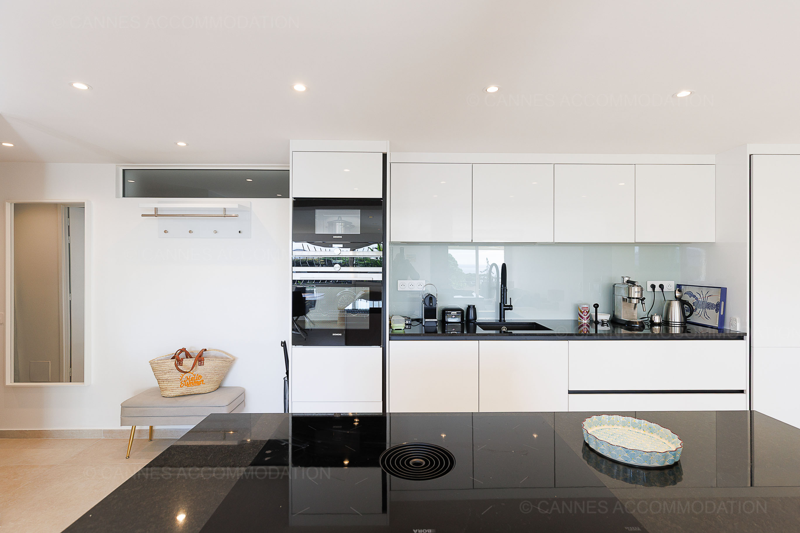 The kitchen is discreet yet cleverly designed. Everything is functional and complements the generous layout of the apartment.