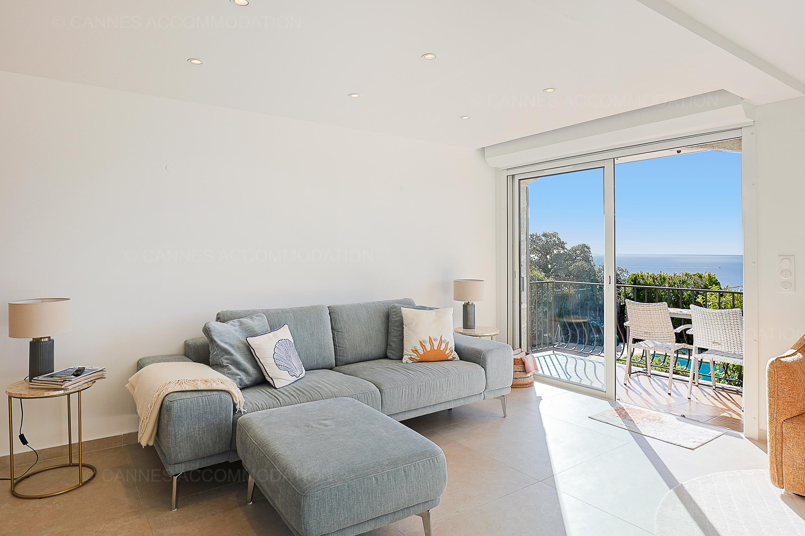 The living room opens onto a terrace with stunning sea views. This bright and serene space extends naturally to the outdoors. The decor is understated and elegant, with a contemporary touch.