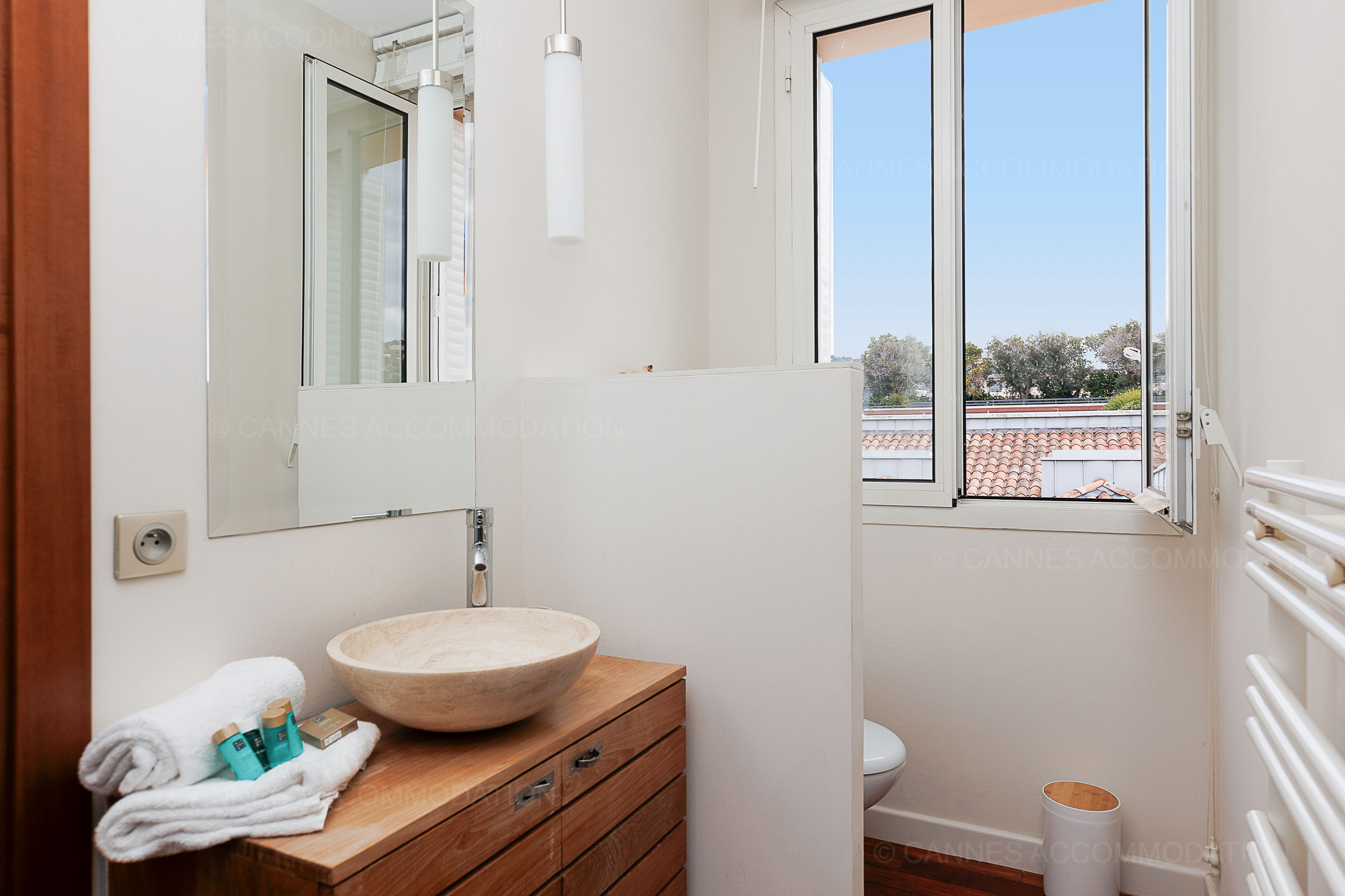 Une petite terrasse est également disponible et offre une superbe vue sur les toits de Cannes.