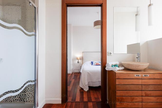 La chambre de maître offre un grand dressing et une salle de bain entièrement ouverte sur le salon, avec baignoire, douche et WC.