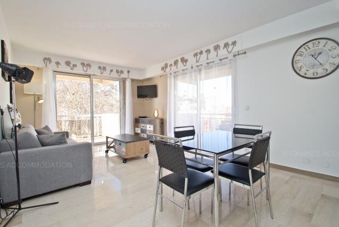 Le salon est organisé en deux espaces : le coin salon qui donne sur un balcon avec la vue dégagée sur la ville. Puis le coin salle-à-manger pouvant accueillir 4 invités autour de sa table de repas. Le canapé est un convertible.