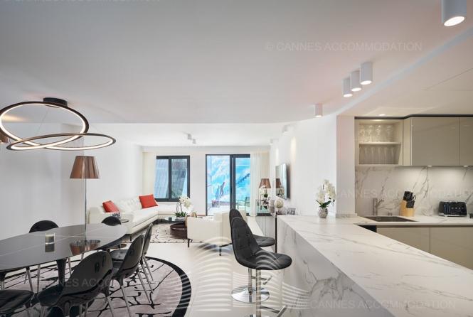La pièce à vivre offre un espace détente avec un grand canapé ainsi qu’une grande table pouvant servir aux repas comme aux réunions. Sa baie vitrée ouvre sur une terrasse avec vue directe sur la Croisette et le Palais des Festivals.