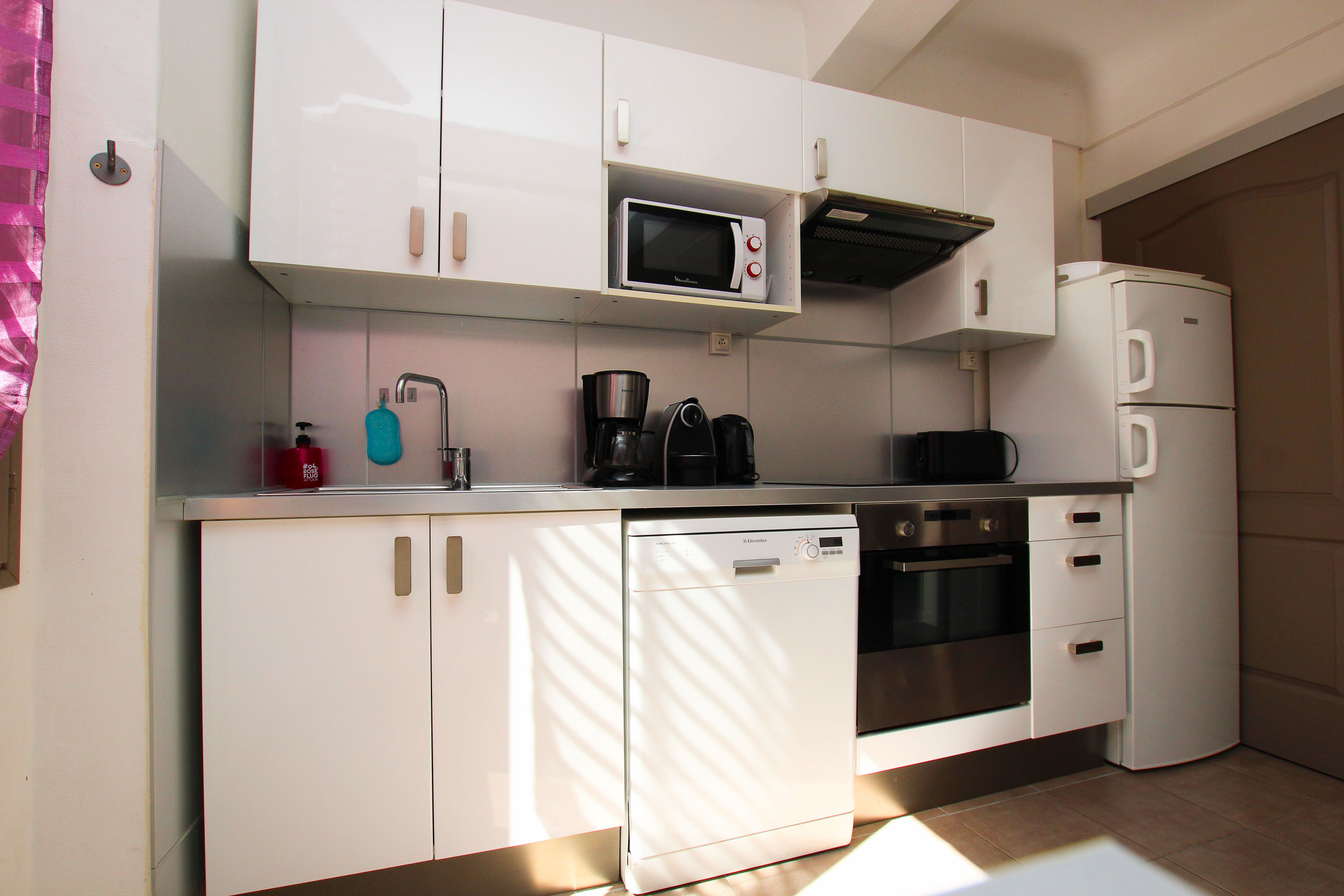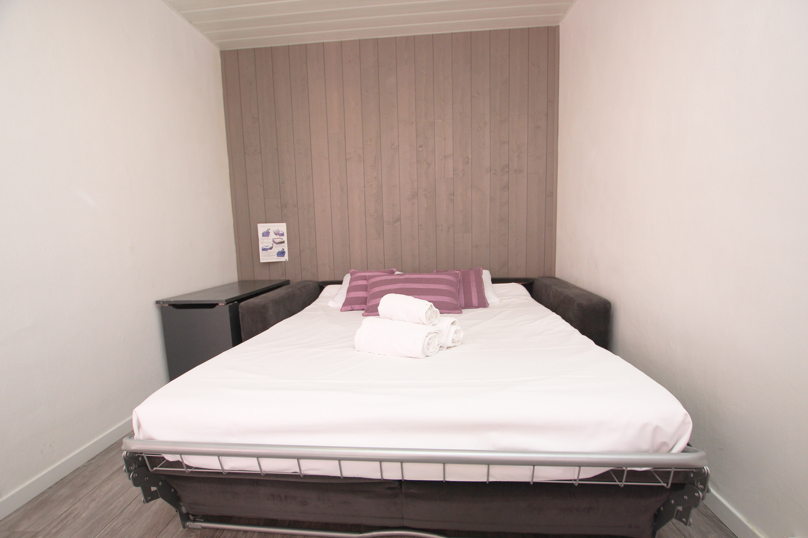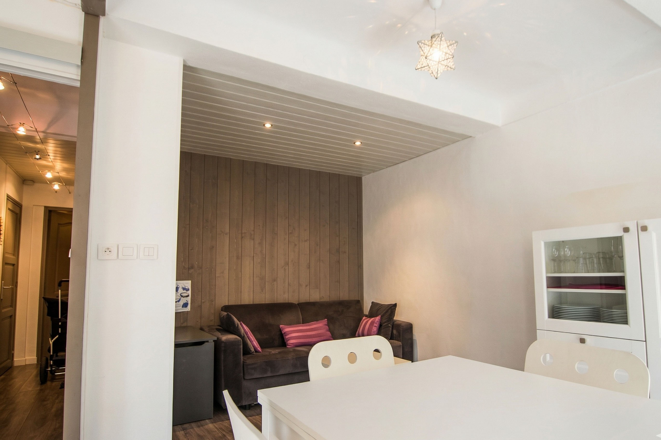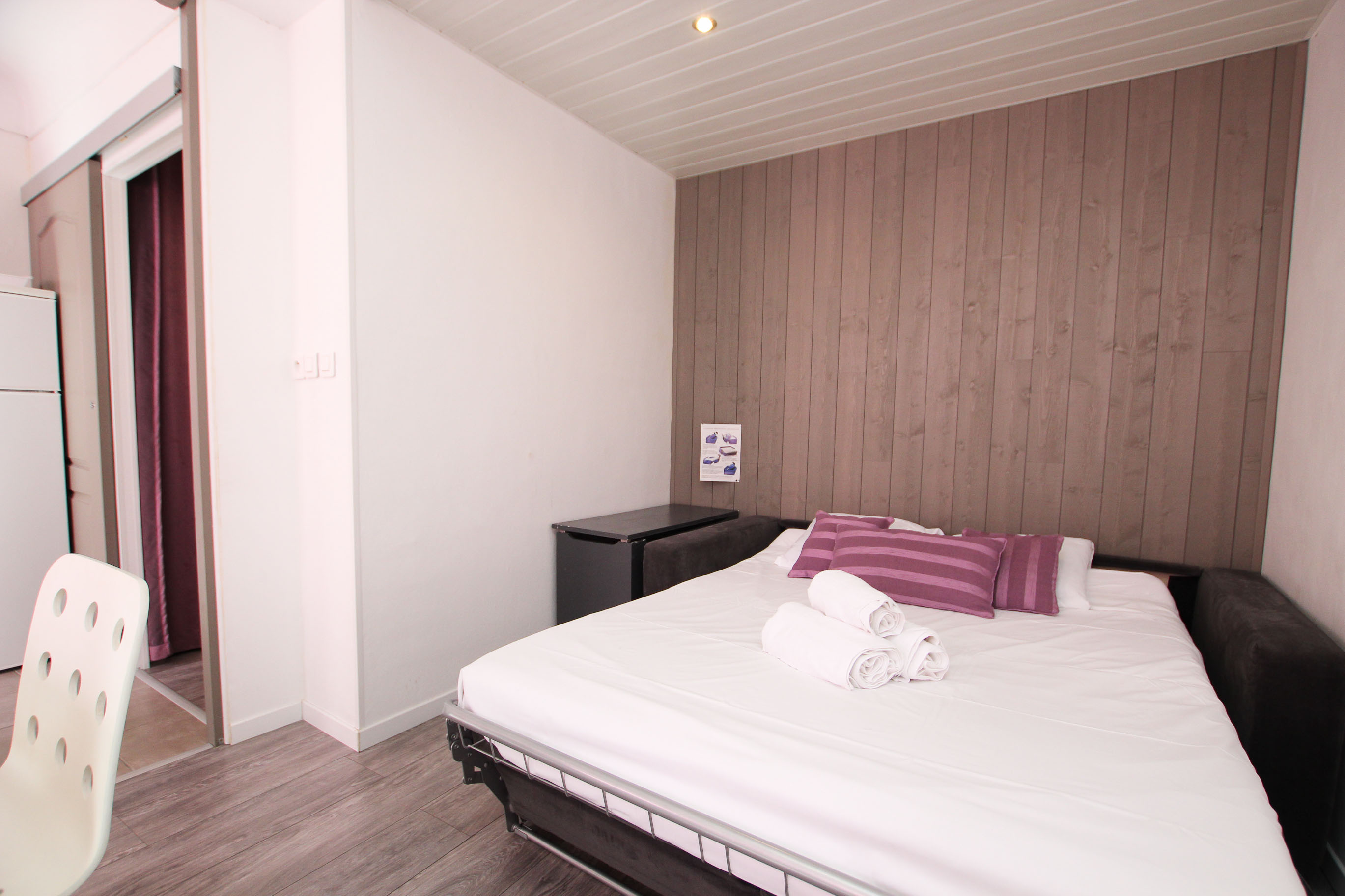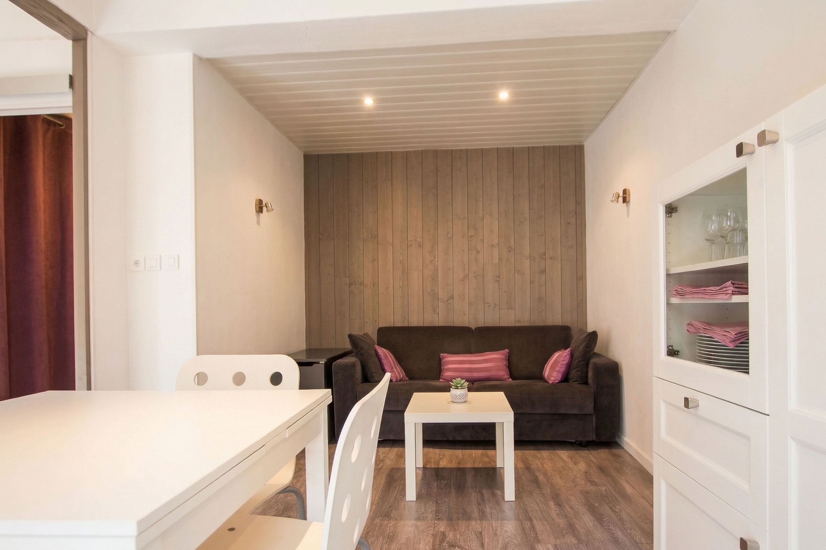 Joliment rénové et pensé pour vous recevoir le temps de votre séjour d’affaires, MAUVE est un appartement particulièrement fonctionnel. L’entrée dessert une chambre indépendante avec un lit double et une salle de douche privative, un wc séparé et un emplacement avec deux lits superposés discrets si jamais vous venez accompagnés ou en famille. Très bien agencée, la pièce principale se compose d’une cuisine toute équipée, ouverte sur un agréable coin salle à manger et un salon dont le canapé est convertible.