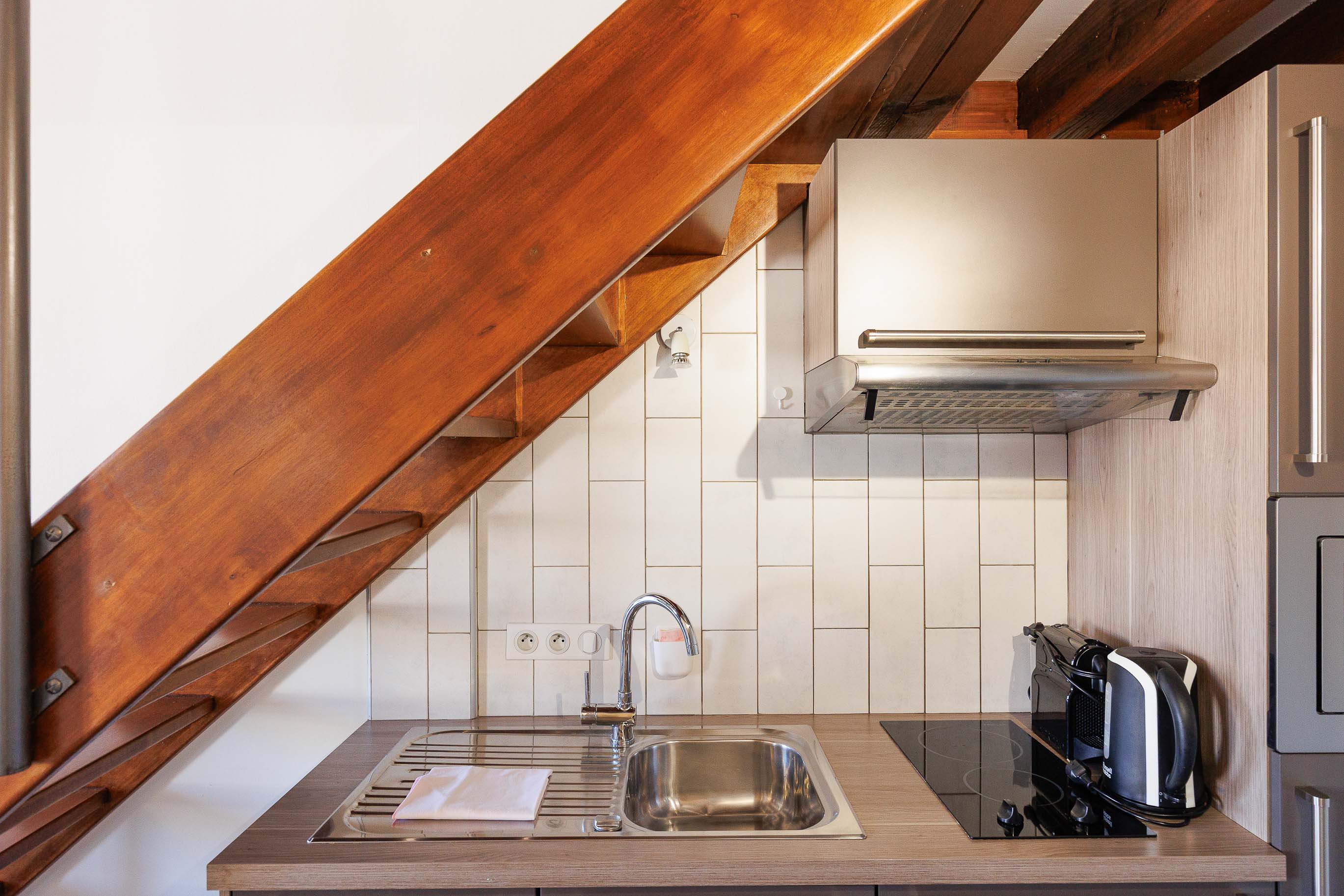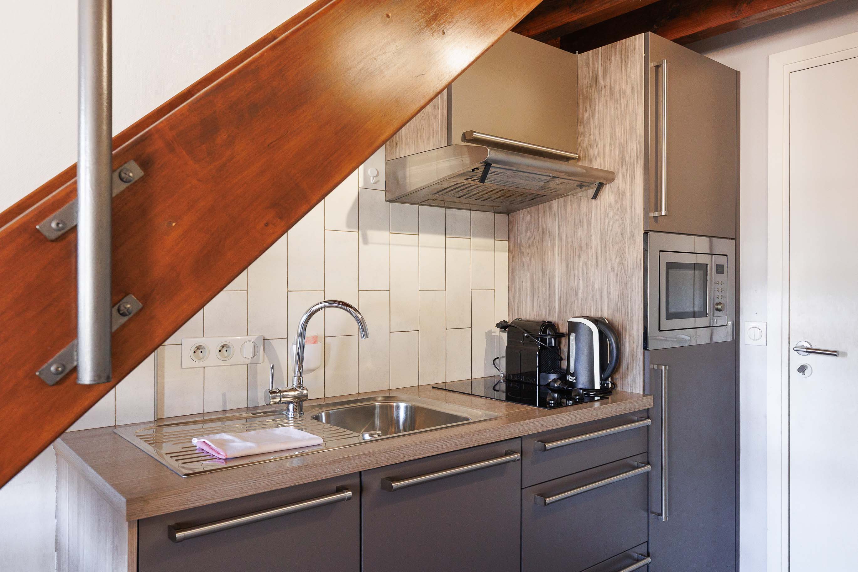 La cuisine ouverte, située sous l’escalier, est entièrement équipée avec de nombreux rangements, un micro-ondes, des plaques de cuisson et une machine à café, offrant tout le nécessaire pour préparer vos repas.