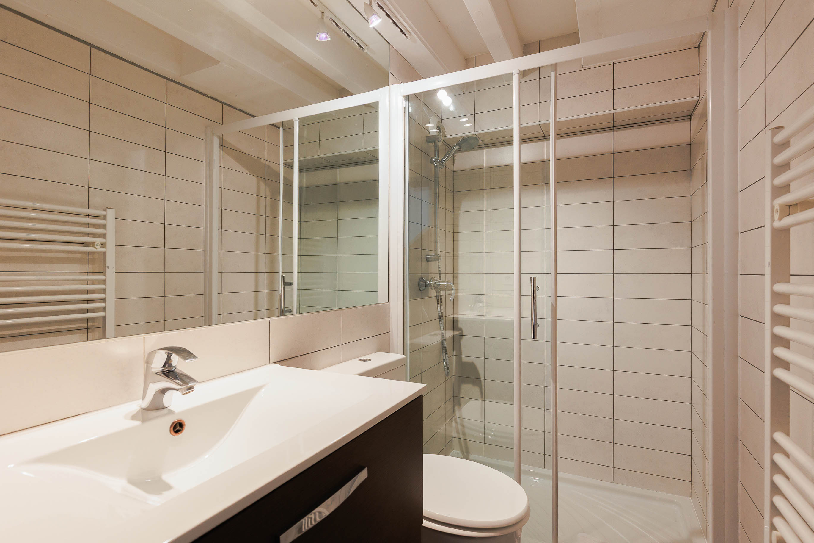 L’appartement dispose d’une salle de bain moderne et élégante, équipée d’une douche à l’italienne et de toilettes, assurant à la fois praticité et confort.