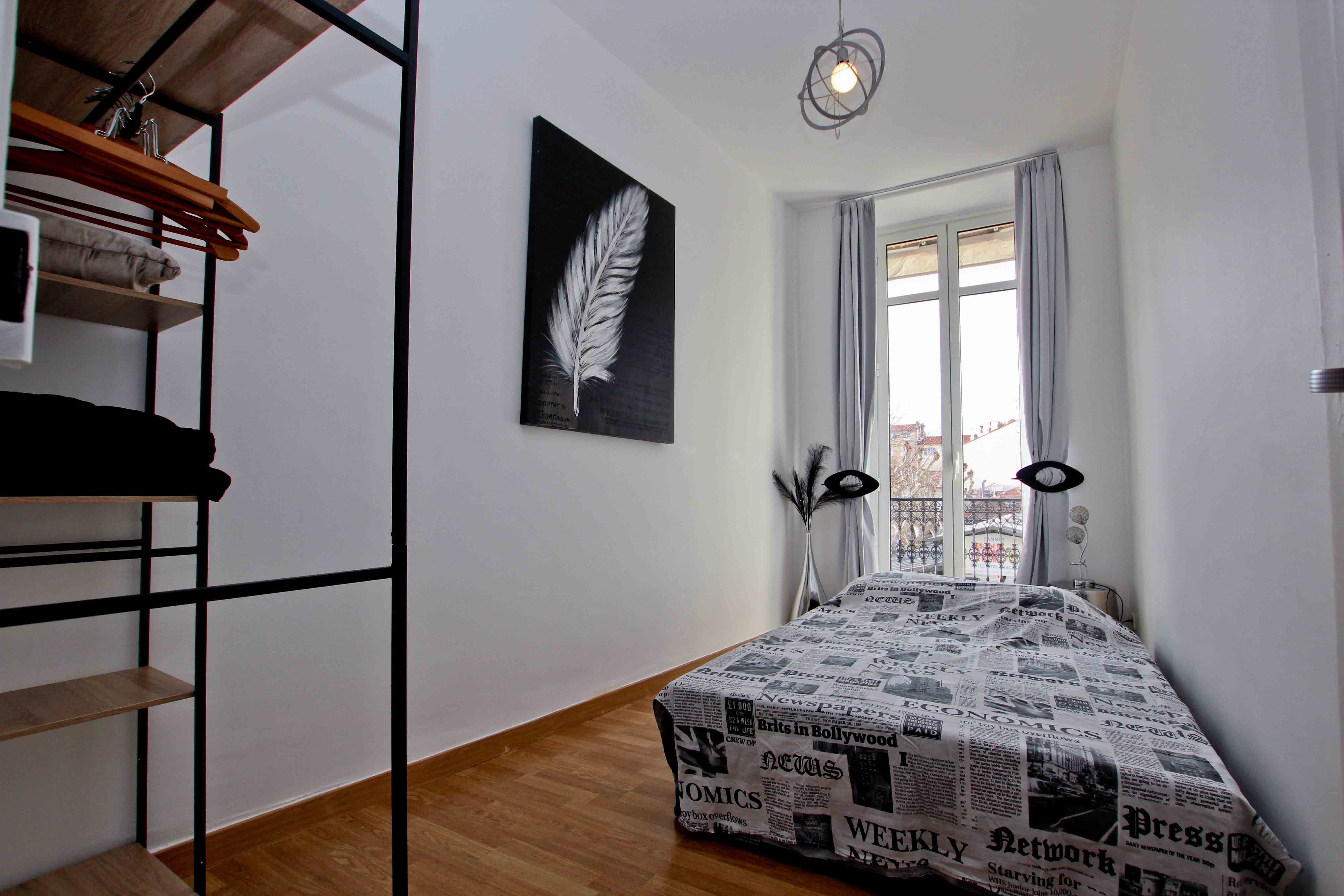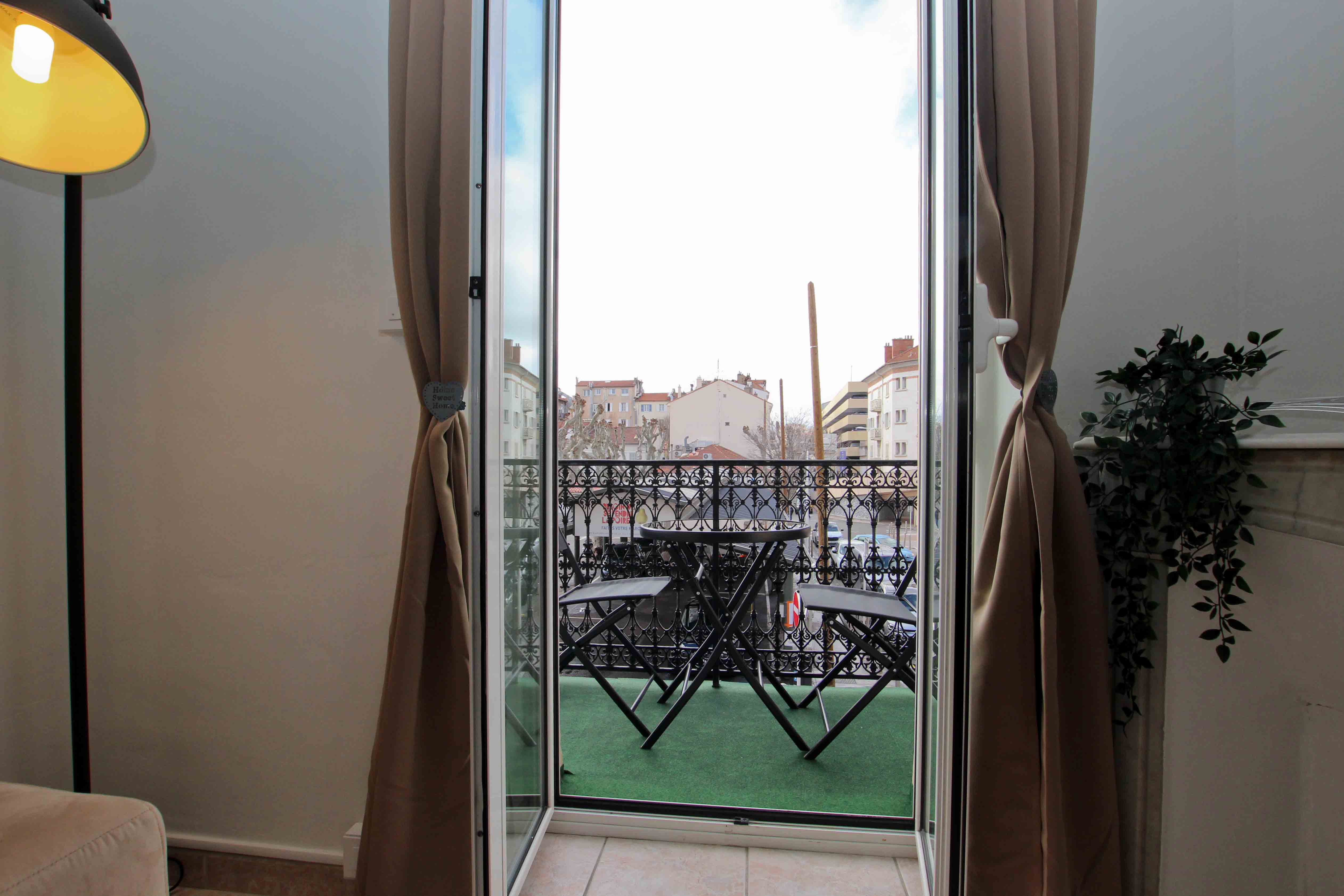 Le séjour est agréable et lumineux. Il s’ouvre sur un grand balcon filant, parfait pour profiter de l’animation du quartier à toute heure de la journée. L’ambiance y est chaleureuse grâce à une décoration sobre et confortable.