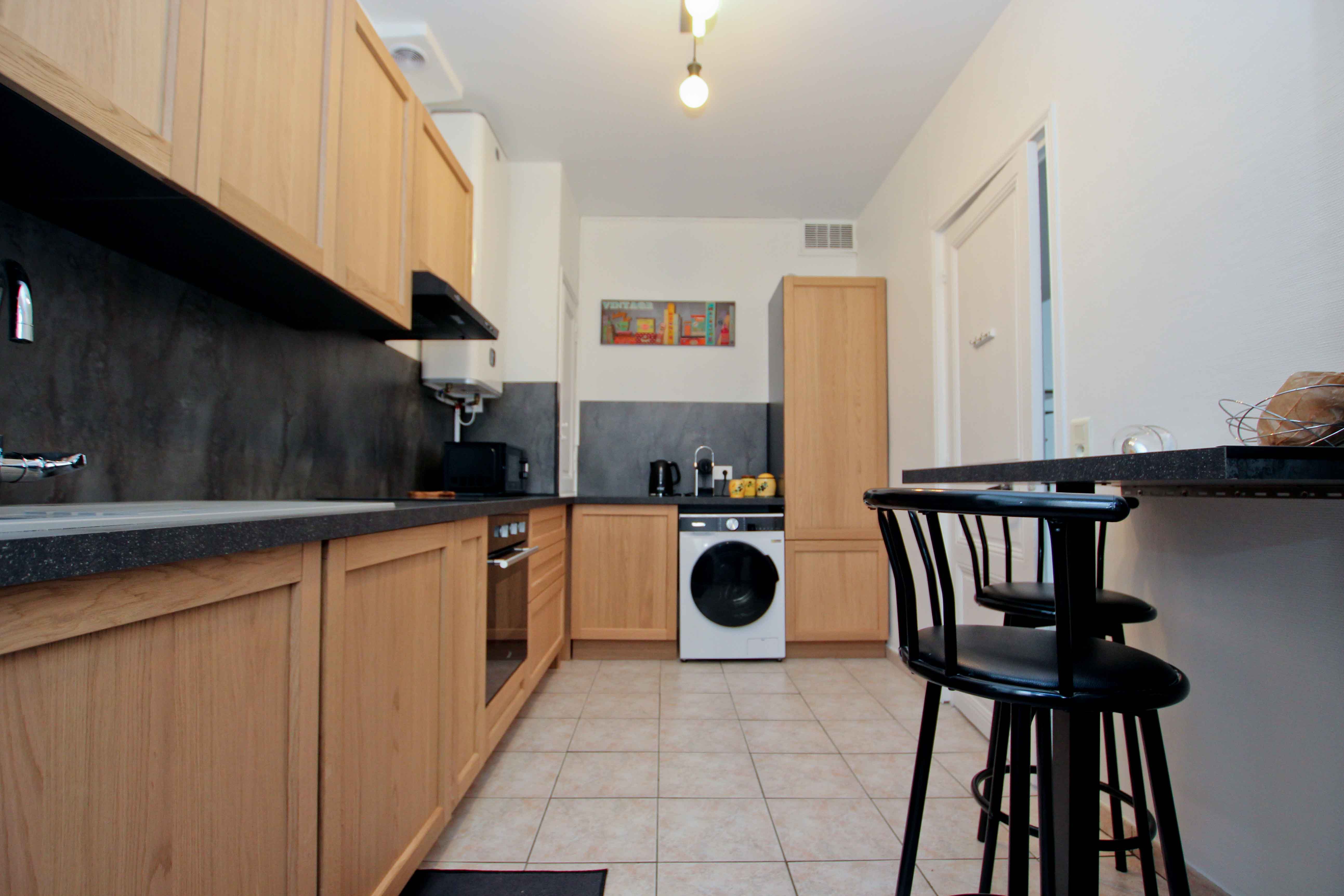 confortablement. Elle est bien équipée, avec des éléments modernes et une table haute pour vos repas.
